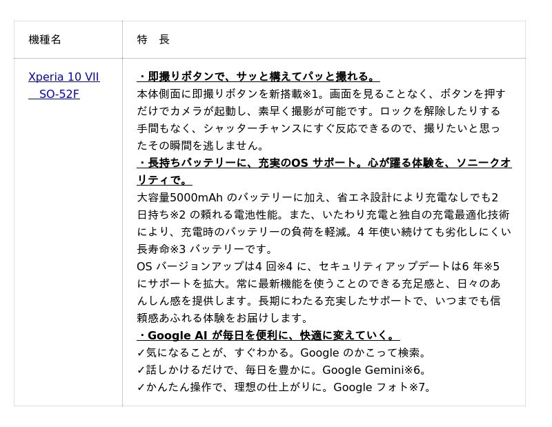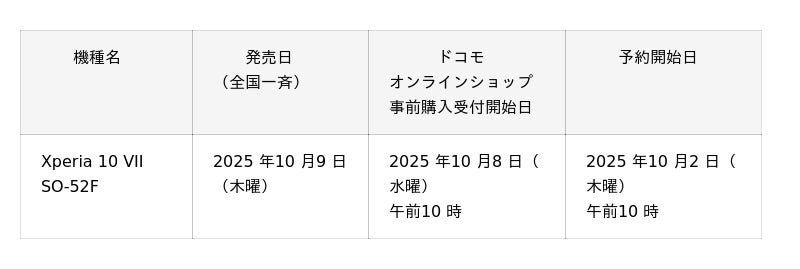 株式会社NTT ドコモ(以下、ドコモ)は、側面に即撮りボタンを搭載し、カメラレンズのレイアウトを一新したシンプルなデザインのスマートフォン「Xperia 10 VII SO-52F」を2025 年10 月9 日(木曜)に発売いたします。発売に先立ち、2025 年10 月2 日(木曜)から予約受付を開始いたします。