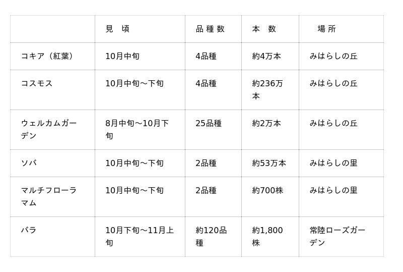 みはらしの丘は、約4万本のコキアで埋め尽くされます。10月上旬頃から徐々に紅葉が始まり、緑と赤のグラデーション、紅葉、赤と茶のグラデーションへと色合いが変化していきます。丘のふもとではコスモスやソバが咲き誇り、裏側ではススキとオギの群生が美しい秋の風景を創り出します。また、第1頂上周辺のウェルカムガーデンや、秋バラなど、多彩な秋の草花が園内を鮮やかに彩ります。