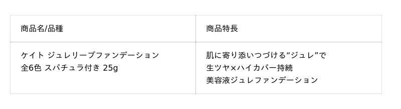 メインアイテムとなる『ケイト ジュレリープファンデーション』は、ファンデーションのカバー素材や「ムーンライトパール*3」などが“美容液ジュレ”に包まれ、肌の上にネットワークを形成し、なめらかな塗膜となり密着します。美容液ジュレが肌に柔軟に寄り添いつづけ、さらに、皮脂と混ざってもくすまず明るいツヤ仕上がりを維持。高いカバー力とツヤ感を持続する“美容液ジュレファンデーション”です。