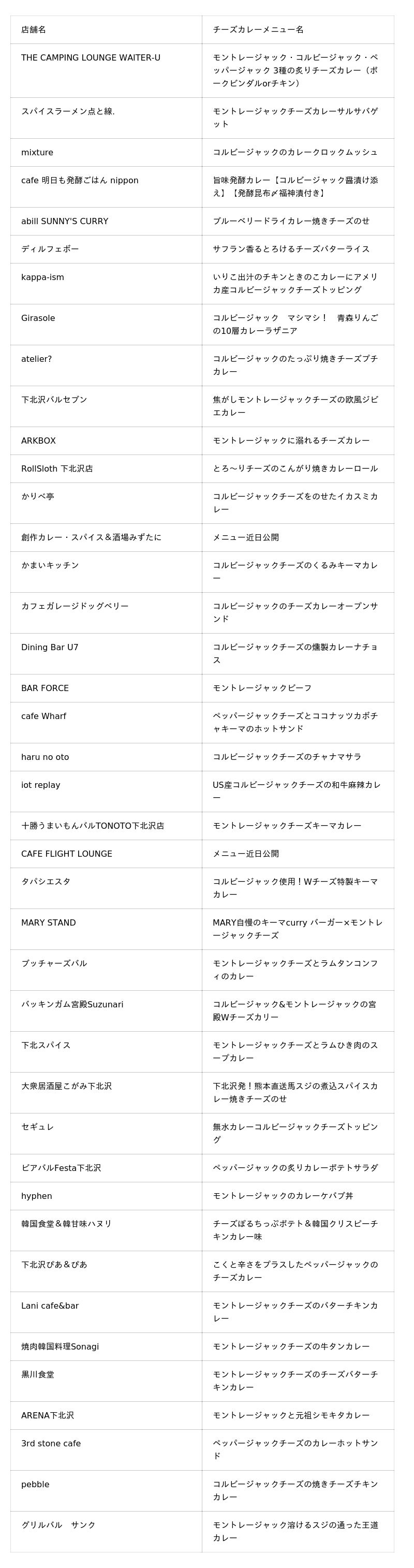 アメリカ産チーズを使った限定カレーや、エスビー食品株式会社が提供する「S&B赤缶カレー粉」、株式会社ヤッホーブルーイングが提供する「インドの青鬼」との、食の魅力が詰まったコラボメニューを展開いたします。多彩な下北沢の飲食店でしか味わえない、限定メニューをご堪能いただけます。