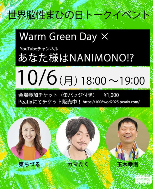 10月6日は「世界脳性まひの日~Warm Green Day~」「あなた様はNANIMONO!?」とコラボ!東ちづる×カマたく×玉木幸則の 台本も忖度もないぶっちゃけトークを生配信!会場参加も大募集!