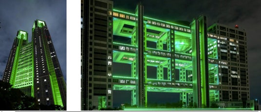 グリーンライトアップされた東京都庁舎とフジテレビの写真