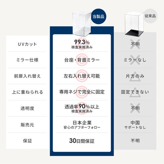 一般的なフィギュアケースと比べ、今回のリニューアル版では以下のような強みがあります。