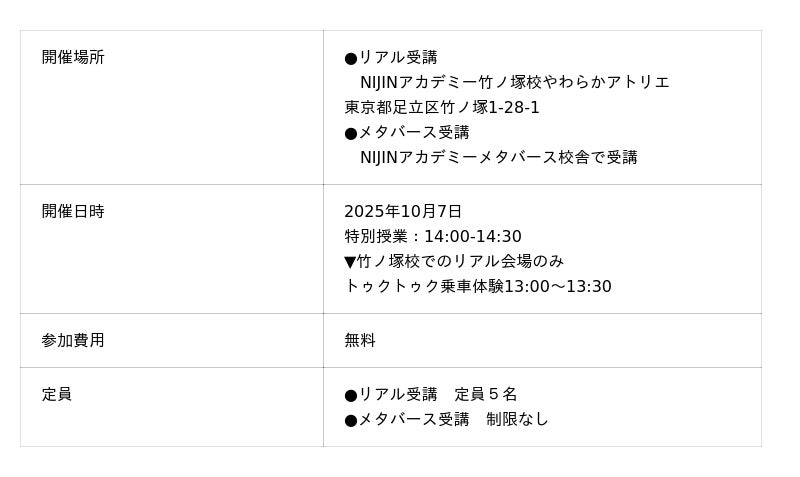 不登校・学校に行きづらい子どもたちの居場所として、全国で展開するオルタナティブスクール「NIJINアカデミー」。学園祭特別授業として選択的不登校一家のおかあ木村かいだ友子さん特別授業を、NIJINアカデミー竹ノ塚校やわらかアトリエと、メタバース校舎にて開催します。