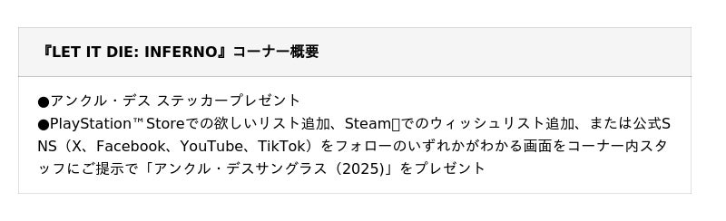 その他、2025年12月4日(木)発売予定のガンホー最新作『LET IT DIE: INFERNO』のコーナーを初出展します。