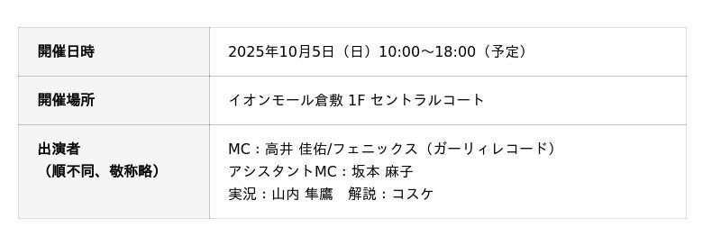 ご好評をいただいております入場無料の大人気オフラインイベント「ガンホーツアー2025」。今回は、2025年10月5日(日)にイオンモール倉敷(岡山県倉敷市)にて開催いたします。