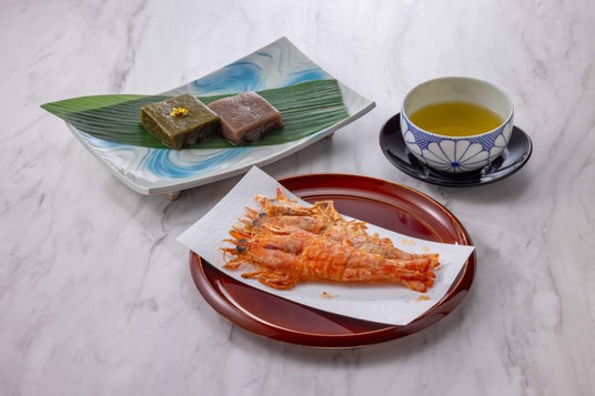 愛知県の県魚でもある国産の車海老を活きたまま仕入れ、ホテル内の厨房でプレス・焼き上げ、旨味を凝縮させた海老煎餅と、本わらび粉を使用した西尾抹茶とこしあんの生ういろうのセット。
