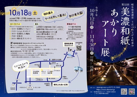 江戸時代の情緒を残す岐阜県美濃市の歴史ある町並みが、美濃和紙で作られたあかりアートに包まれる「美濃和紙あかりアート展」。今年も約2か月にわたり開催します。美濃和紙の繊細な美しさと歴史ある町並みの風情を、ぜひご体感ください。