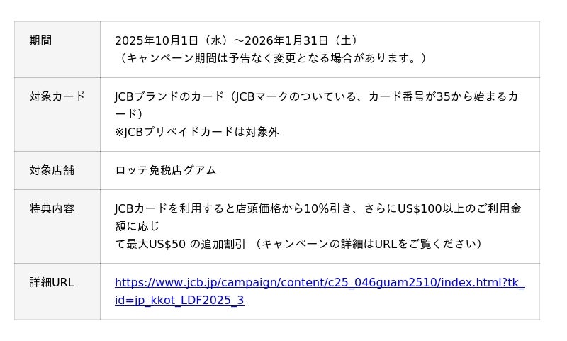 日本発唯一の国際カードブランド運営会社である株式会社ジェーシービー(本社:東京都港区、代表取締役会長兼執行役員社長:二重 孝好)の海外業務を行う子会社、株式会社ジェーシービー・インターナショナル(本社:東京都港区、代表取締役社長:陽川 勝樹)(以下、総称して「JCB」)と、ロッテ免税店グアム(代表者:Jaejun Lee、以下「ロッテ免税店グアム」)は、2025年10月1日(水)から2026年1月31日(土)まで、グアム国際空港内「Lotte Duty Free Guam(ロッテ免税店グアム)」にて期間限定で特別キャンペーンを実施いたします。