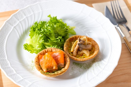 「キッシュプレートサーモンきのこ」は、朝食や軽いお食事にぴったりのヘルシーなキッシュプレートです。抹茶ホワイトソースとスモークサーモン、きのこマリネの塩気が相性抜群。フレッシュなグリーンサラダと共にお楽しみください。