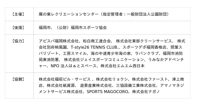 - 親子でテニス体験会(対象:5歳~小学3年生と保護者、定員:20組40名)
