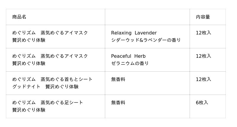 「めぐりズム 贅沢めぐり体験」シリーズは、これからの季節にぴったりな2種の香りのアイマスクと、首もとシート、足シートを組み合わせた4商品。目・首・足に一緒に使うことで、気分までときほぐれて、全身に心地よさめぐるひとときを提供します。