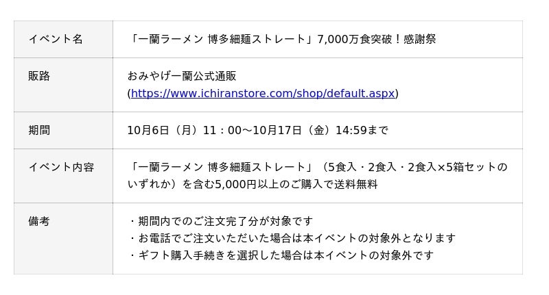 「一蘭ラーメン 博多細麺ストレート」が7,000万食を突破したことを記念し、期間限定で送料無料企画を実施いたします。
