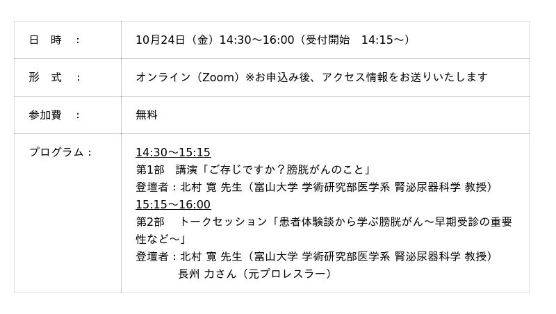 <アストラゼネカ株式会社主催 オンライン市民公開講座>あなたにも知ってほしい膀胱がんのこと 元プロレスラー・長州 力さんと一緒に、専門医から学ぶ膀胱がんの基礎と実際