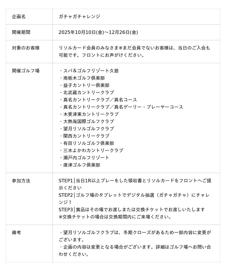 リソルグループが運営するゴルフ場 14 コースでは、リソルカード会員向けキャンペーンとして2025年10月10日(金)から12月26日(金)の期間、豪華景品が当たる『ガチャガチャレンジ』を開催いたします。