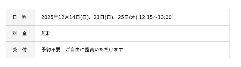 福島県内の演奏団体によるクリスマスコンサートを開催いたします。贅沢な空間で、上質な音楽をお愉しみください。