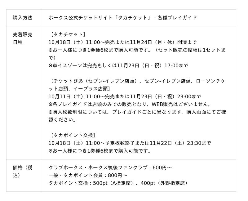 タカポイント会員・タカポイント交換(クラブホークス会員・タカポイント会員)・一般を対象に入場券の先着販売します。