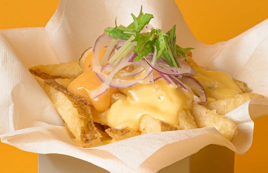 初出店となるアソンブロッソ!からは、通常1種類のところを2種類のWガーリックマヨネーズをたっぷりかけたフライドポテトを提供。