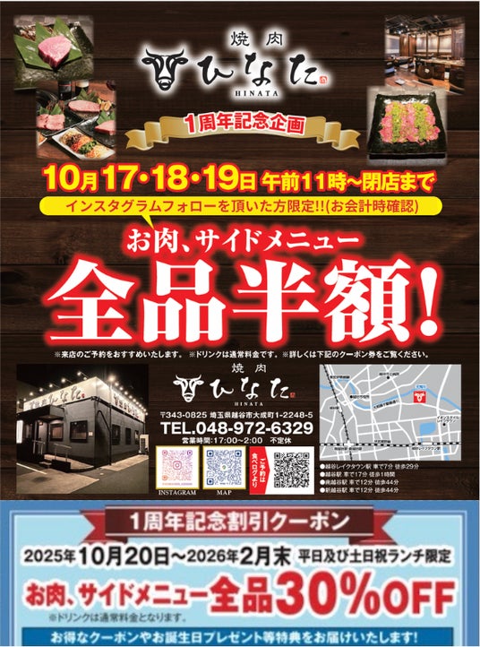 この度、焼肉ひなたは日頃からご来店頂いております皆様のお陰で、1周年を迎えることができました。そこで、お客様への日頃の感謝と還元の意を込めて10月17日~19日の3日間で肉メニュー / サイドメニューをなんと全品半額でご提供致します!!赤字覚悟の大還元ですのでお見逃しなく!!有り難いことに多数のご予約を頂いております。まだ若干の空きがございますので、是非ともお早めにご予約くださいませ。(※在庫に余裕は持たせておりますが、限りもございますのでご希望の商品がございましたら、商品名 / 個数も明記の上のご予約をおすすめしております。)また、3日間にご来店頂けないお客様向けには2025年10月20日~2026年2月末日までご利用可能な【全品30% OFFクーポン】もご用意しております。ご希望のお客様は文頭にございます【クーポンチラシ】画像を保存の上、ご予約時にご利用の旨お伝えください。(※クーポン画像はご来店時にご提示くださいませ。)