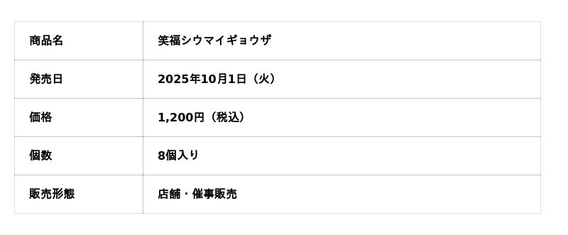 栃木県JR鹿沼駅前で焼売のテイクアウト専門店「笑福(えふ)シウマイ」を運営する株式会社フク(所在地:栃木県鹿沼市上野町113-9、代表取締役社長:福田勇紀)は、このたび新商品「笑福シウマイギョウザ」を2025年10月1日(火)に発売しました。