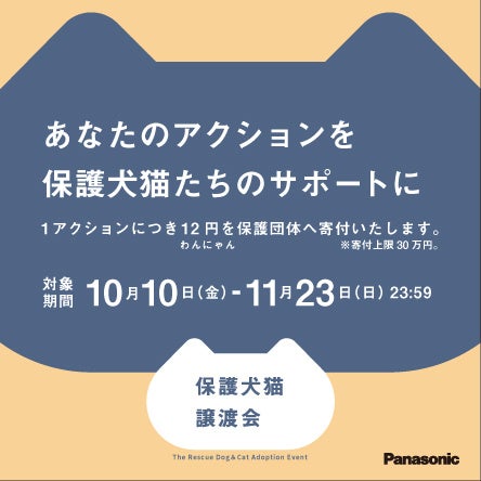 10月10日(金)にパナソニック公式SNSから発信予定のキャンペーン告知の投稿へのいいねやリポスト、または本イベントへの応援メッセージとハッシュタグ「#パナソニック保護犬猫譲渡会」をつけて投稿・リポストなどのアクションをしていただくと、1アクションにつき12円(ワンニャン円)を、パナソニックから動物保護団体に寄付します。