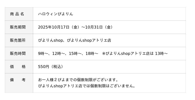 ジェイアール東海フードサービス株式会社(本社:愛知県名古屋市、代表取締役社長:岩下賢一)は、人気スイーツ「ぴよりん」の季節限定商品「ハロウィンぴよりん」を、2025年10月17日(金)~10月31日(金)まで販売いたします。2011年の初登場以来、登場のたびに話題を呼んできた「ハロウィンぴよりん」が、今年もハロウィンシーズンを彩ります。