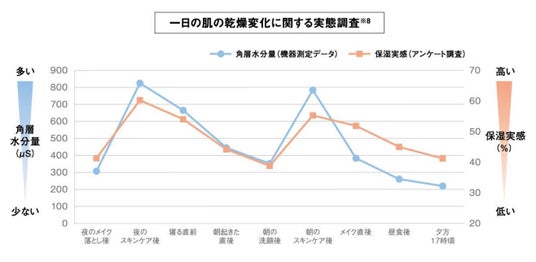 ナチュリエが一日の肌の乾燥変化に関する実態調査をしたところ、夜、丁寧にスキンケアをしても、就寝中に水分が蒸発し、起床時の肌は、夜のスキンケア後と比べて角層水分量が減少していることが分かりました。朝の洗顔後は、水分が一層少なくなることも判明しています。