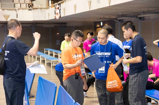 国士舘大学武道学科の授業の一つに「地域武道実習」があります。この実習で学生は各地の武道館や武道施設で実務を経験し武道における社会活動に携わります。今回、受入れ先施設の一つとして、全日本空手道連盟は7名の実習生を大会運営スタッフとして受け入れました。学生は大会期間を通して中央競技団体としての組織運営・大会運営の在り方や課題を学び改善策の提案などを行い、この実習は今後の空手界をけん引する若手人材育成の場となりました。