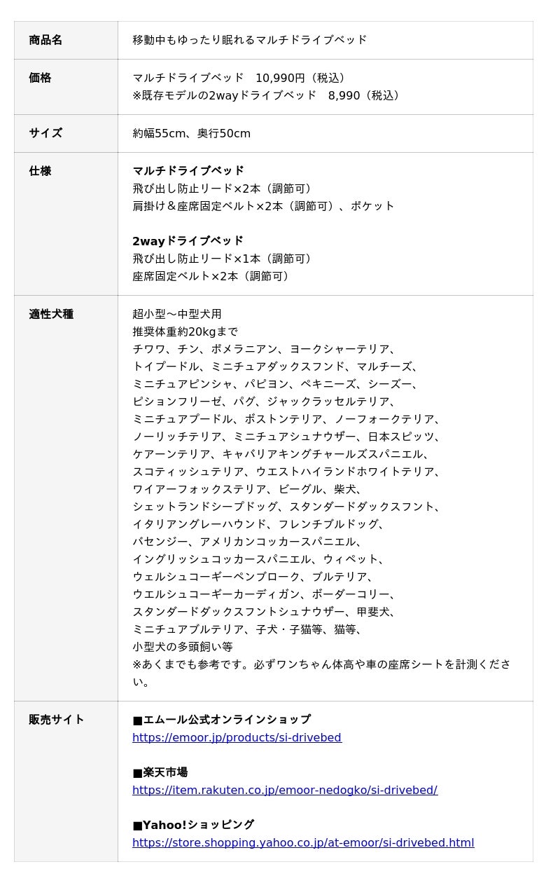寝室インテリアのEC事業を展開する株式会社エムール(東京都立川市:代表取締役 高橋 幸司)が運営する、愛犬愛猫専用寝具ブランド『エムールねどっこ』は、2025年10月6日より、犬との住まいアドバイザーが考えた『移動中もゆったり眠れるマルチドライブベッド』の販売を開始しました。ワンちゃんとのドライブをもっと楽しく、もっと快適にするドライブベッドです。