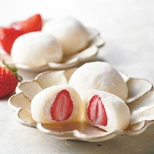 【内容】もち粉とうるち粉をブレンドしたやわらかく伸びのある大福で、ホイップクリームと福岡県産あまおうを1粒包み込みました。やわらかいお餅の食感といちごの酸味、やさしい甘さのクリームが1つになった味わいのバランスをお楽しみください。