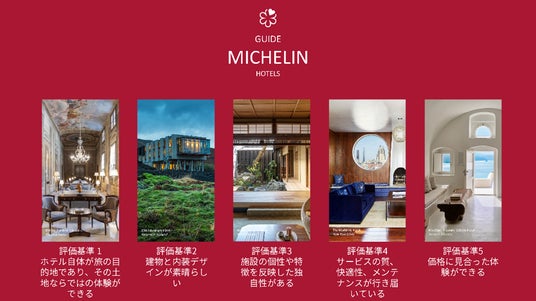 「創刊から125年、ミシュランガイドはホスピタリティの世界において“卓越”の定義を刷新します。ミシュランの星が世界最高のレストランを称えるように、ミシュランキーは、デザイン・サービス・ロケーションすべてが忘れがたい瞬間を生み出す、真に特別な滞在を提供する宿泊施設を称えます。ミシュランキーにより、ミシュランガイドは新たな基準を確立し、専門性を活かした現地調査に基づき世界中から最高の宿泊施設を選定しました。象徴的なリゾート、歴史ある都市型ホテル、隠れ家的な宿まで、ミシュランキーは、旅人に感動と発見をもたらす、信頼できるガイドとなります」