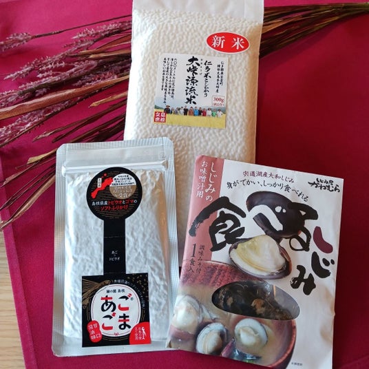 「島根の味覚おみやげセット」朝食ブッフェでも人気の「仁多米」「あごごま」「しじみの味噌汁」を詰め合わせました。旅の余韻をご自宅でも楽しめる、特別な贈りものです。