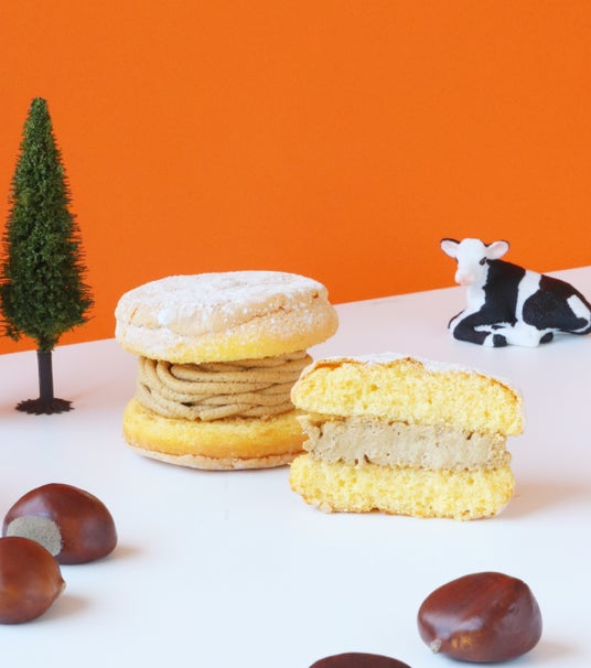 濃厚モンブランペーストにマスカルポーネとあさぎり牛乳を合わせた、なめらかでやさしい甘さのモンブランクリームを、さっくり軽い食感のバターサブレでサンド。