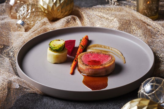 フランス料理の世界大会で受賞歴を持つ、ホテル総料理長 中宇祢満也が手掛けるスペシャルコースには、素材や風味を最大限に活かした聖夜に相応しいメニューをご用意いたしました。コースは、贅沢に雲丹とキャビアを添え貝出汁がふわっと香る車海老サラダ仕立てのオードブル、フォアグラのステーキと栗のピューレを合わせた濃厚な茸のポタージュ、シルエットが美しい平目とムール貝のフォンダンをラインナップ。メインディッシュは柔らかい国産牛フィレ肉に旨味を凝縮させた香ばしい根菜のデュクセルで包み込み、アクセントにエシャロットのピューレでお楽しみいただきます。デザートはチョコレートのムースとラズベリーのジュレにミルクエスプーマとピスタチオのソースを添え、雪が降りそそぐ情景を描いた一皿で聖なる夜を締めくくります。