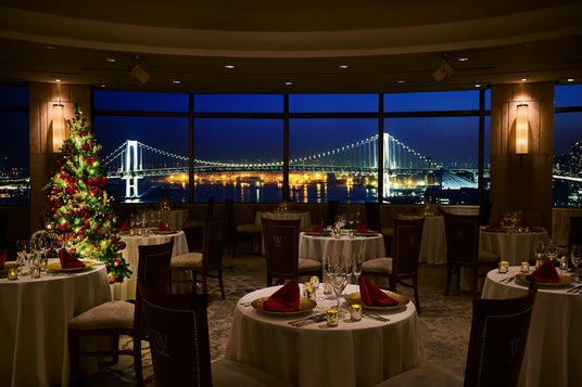 クリスマスデコレーションとレインボーブリッジなどの煌びやかな東京湾の夜景とともにクリスマスイブを楽しめる