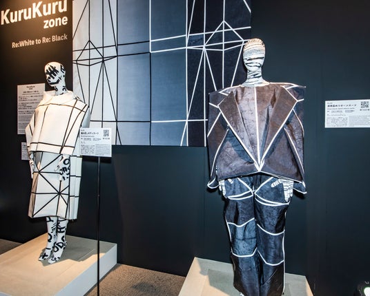 作品には、吉村解体から提供されたエアバッグ素材を使用し、京都紋付の伝統的な染色技術「京黒紋付染め」で「漆黒」に染め上げることで、染めた前後で違った表情を楽しめる仕様となっています。また、三恵メリヤスの太陽光発電で動く吊り編み機で編まれたボディスーツには、世界の様々な言語での一人称(「わたし」「I」「나」など)をプリント。編み直すことで予測不可能な面白みのある生地に生まれ変わる仕掛けになっています。伝統技術と現代のサステナブルファッションを融合させ未来のファッションの可能性を提示しました。