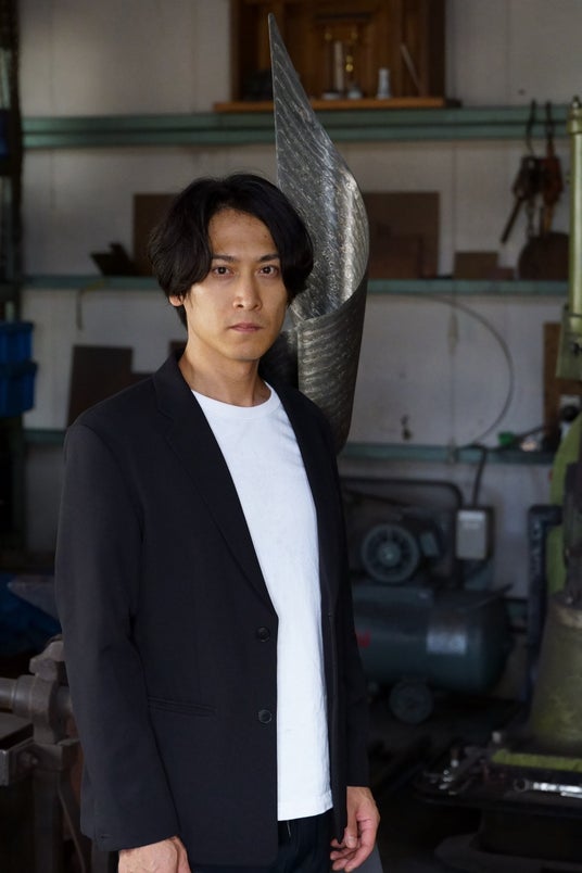 ダマスカス鋼を用いた金属造形を特徴とし、自ら数種類の鉄とニッケルを熱と圧力で積層、波状模様を生み出す独自の素材をつくり出す。その技法によって素材そのものの表情を引き出し、金属の堅さを感じさせない流線的で軽やかなフォルムを追求している。金属の“線”や“面”の可能性を広げ、風にたなびくような動きを思わせる造形を目指し、素材が持つ伝統性や物理的制約を尊重しながらも、それを超えた彫刻的・造形的表現に挑戦している。