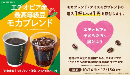 株式会社ファミリーマート(本社:東京都港区、代表取締役社長:細見研介)は、継続して取り組んでいる5つのキーワードの1つである「『あなた』のうれしい」の一環として、伊藤忠商事株式会社(本社:東京都港区、代表取締役社長:石井敬太、以下伊藤忠商事)とともに、「FAMIMA CAFE」の「モカブレンド」「アイスモカブレンド」の販売数に応じて、エチオピアのこどもたちの教育環境の改善に役立てられる寄付の取り組みを2025年10月 14日(火)から沖縄県を除く全国のファミリーマート約16,000店にて実施いたします。本年は新たにコーヒー農園への苗木寄付の取り組みも実施いたします。