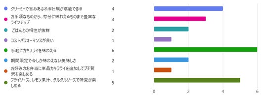 最も多くの票を集めたのは『手軽にカキフライを味わえる』というポイントでした。以下2位は『フライソース、レモン果汁、タルタルソースで味変が楽しめる』、『クリーミーで旨みあふれる牡蠣が堪能できる』でした。