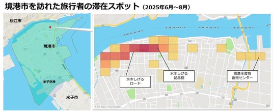 2025年夏の訪日外国人滞在数増加率ランキングの1位は鳥取県の境港市でした。境港市での滞在エリアを確認すると、漫画家・水木しげる氏が描く妖怪の世界を楽しめる水木しげるロード周辺での滞在が多いことが確認できたほか、境港水産物直売センターでも滞在が見られました。