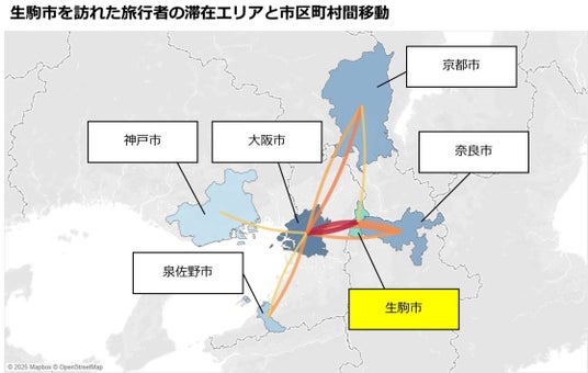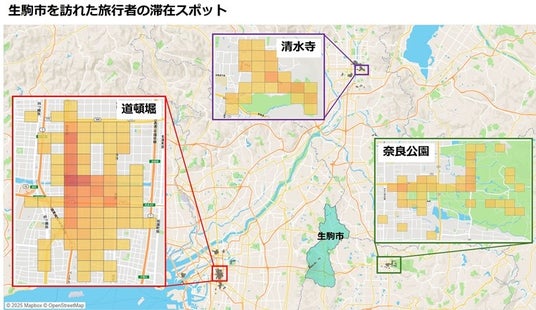 生駒市を訪れた旅行者は他にも、道頓堀(大阪市)、奈良公園(奈良市)、清水寺(京都市)といった関西の有名スポットを一緒に回っていることも確認できました。