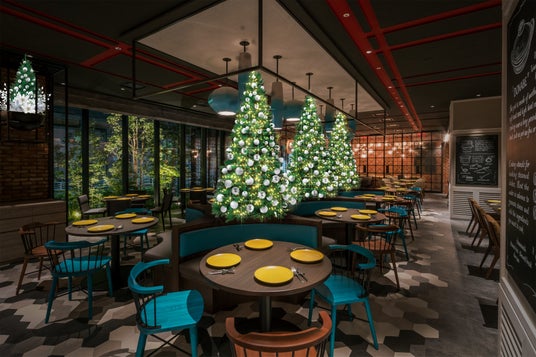 「Restaurant&Bar TIDE TABLE Shiomi」の中央には、温かみあるもみの木の装飾が施され、洗練された空間に季節の彩りを添えます。夕暮れ時にはライトアップが幻想的に輝き、ロマンティックなひとときをお過ごしいただけます。
