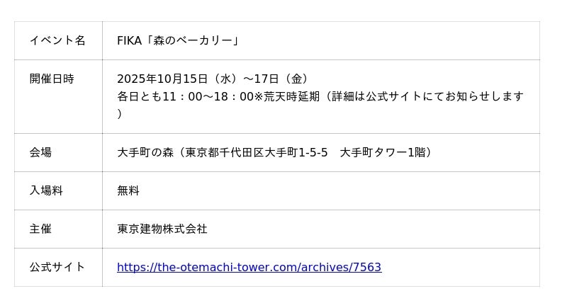 東京建物株式会社は、個性豊かなベーカリー10店舗※が集結するFIKA「森のベーカリー」を2025年10月15日(水)~17日(金)(各日とも11時~18時)の3日間にわたり、地下鉄大手町駅に直結する「大手町の森」(東京都千代田区、大手町タワー1階)で開催しますのでお知らせします。都心の森で過ごす特別なひとときをお楽しみください。
