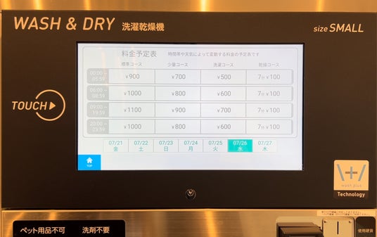 ダイナミックプライシング実施店舗のタッチパネル付き洗濯乾燥機では"価格予報"がいつでも見られる