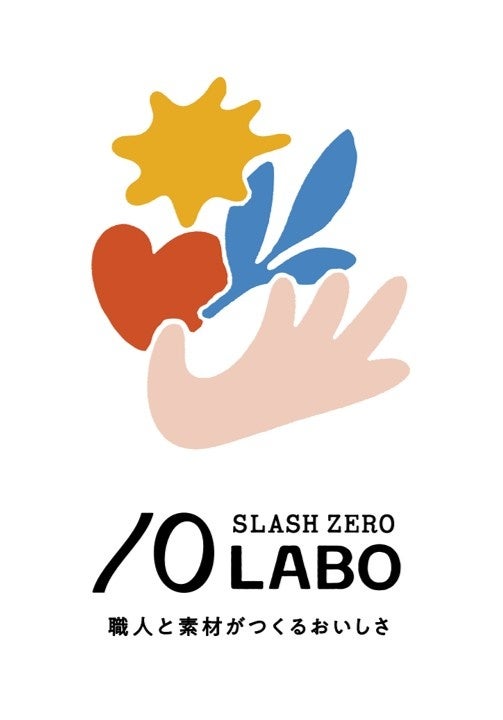 ロゴマークは、スラッシュゼロ ラボがめざす「おいしい」の在り方を表しています。赤いハートは「職人の真摯な思い」。青い葉は「厳選した素材」。黄色は「お客様の心地よいひととき」。おいしさを作るには欠かせない3つの要素を、職人の手が支えている様子を表しています。