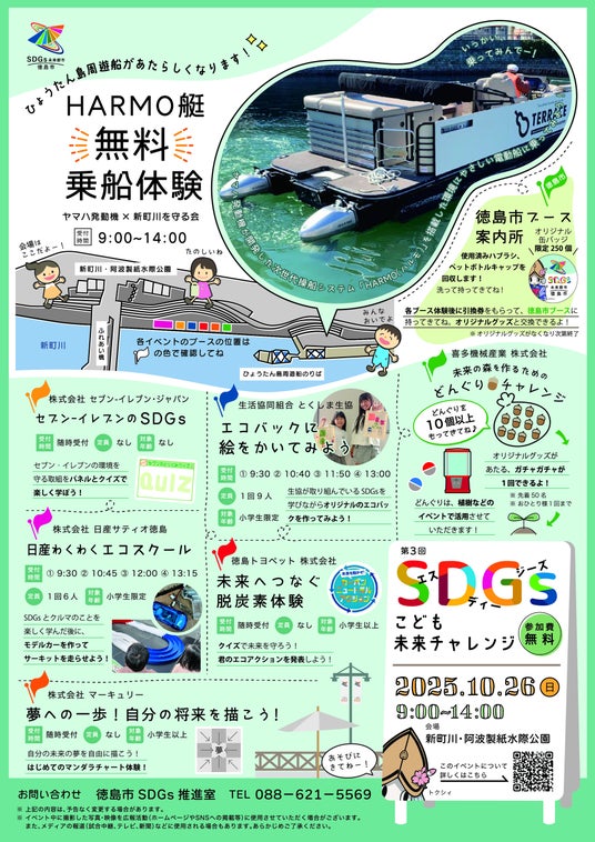 徳島市のパートナー企業によるSDGs体験ブースや電動船の試乗体験など、親子で学んで楽しみましょう。同時開催される「とくしまマルシェ」とともに、まちなかを遊び倒そう!