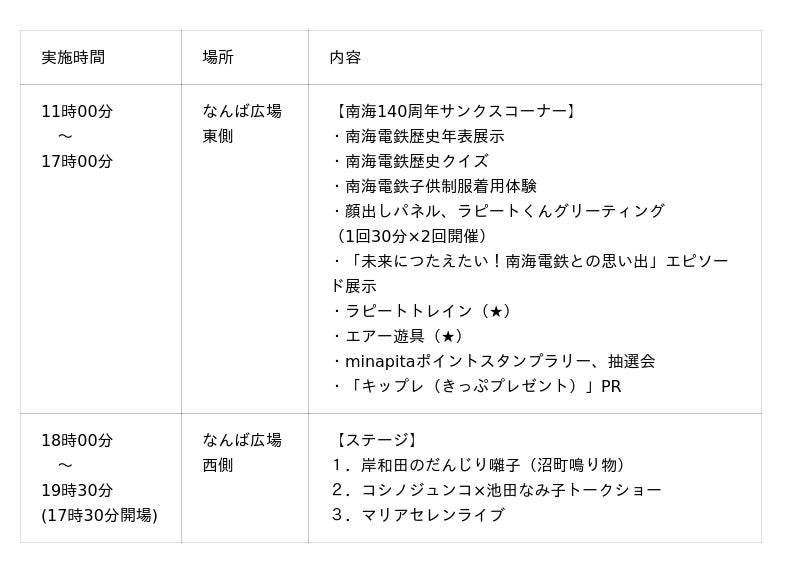 本イベントは、なんば広場東側の「南海140周年サンクスコーナー」(11時~17時)と西側の「ステージ」(18時~19時30分)の2部構成で展開します。
