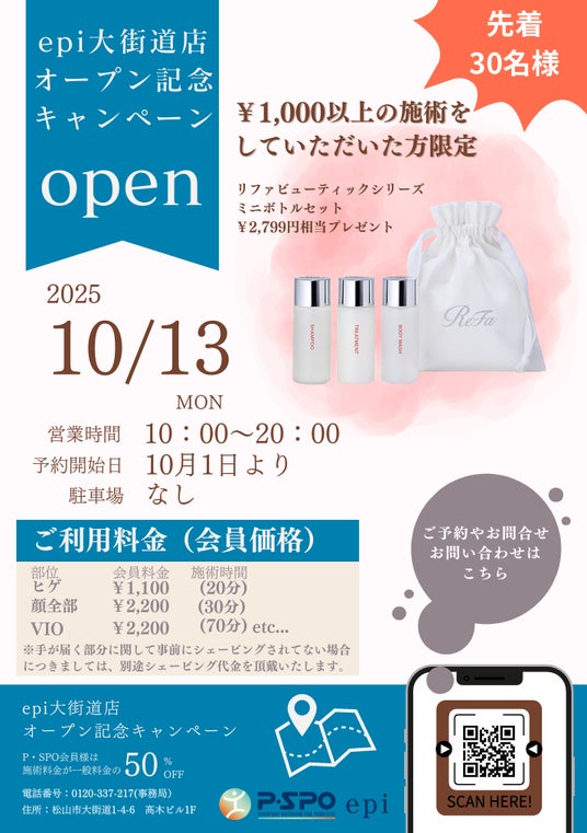 『P・SPO epi大街道店』オープン記念!非会員も利用OK、会員はさらにお得に。先着30名様にReFa商品プレゼント