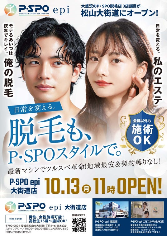 株式会社三福ホールディングス(本社:愛媛県松山市)が運営するP・SPO epi(ピースポ エピ)は、このたび松山市の中心地に位置する大街道に、脱毛専門店の3号店となる『P・SPO epi大街道店』を10月13日(月)午前11時にグランドオープンいたします。