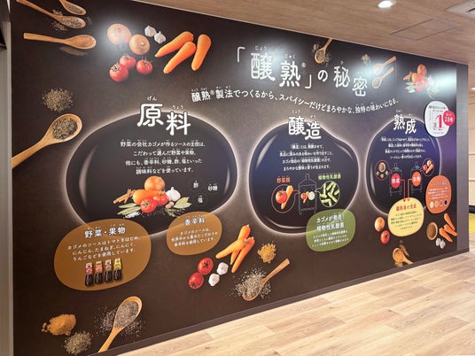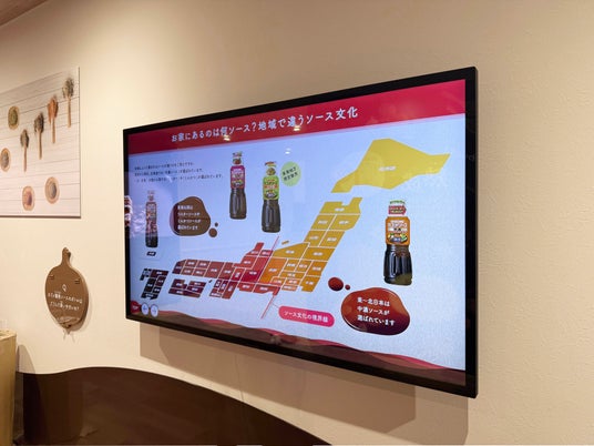 見学通路には展示やモニターを設置し、楽しみながらソースの種類や製法、活用法等を学んでいただくことができます。また、香辛料の展示も行っており、香りの違いを体験していただくことができます。モニターでは、地域ごとに異なるソース文化の紹介なども行っており、新たな発見につながる内容となっています。